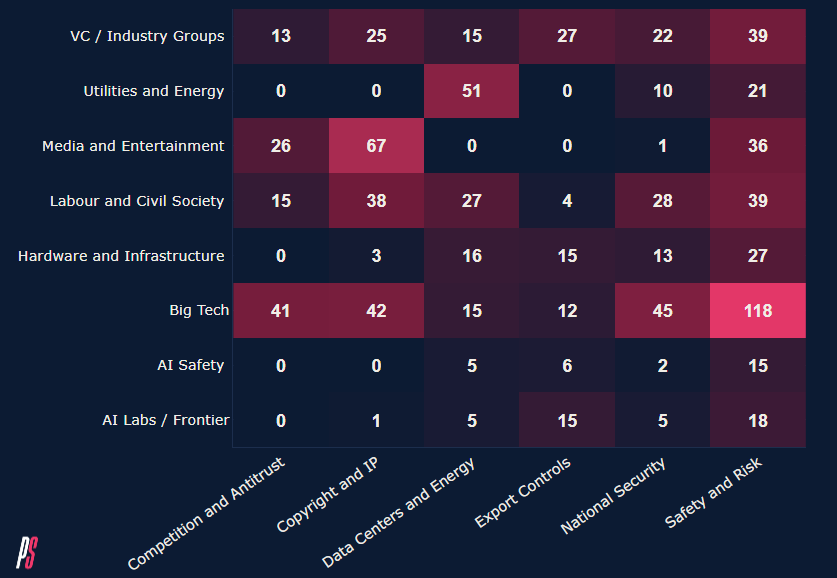 However, there are some lessons we can draw from this data. For one, it strengthens the claim I made in part 1 that big tech “floods the zone,” dominating the information flow to Hill staffers and representatives compared to other actors Another is that VC firms (A16Z) and industry groups (Business Software Alliance, ITIF, National Artificial Intelligence Association) take up plenty of volume, lobbying consistently on export controls, copyright laws, safety, and beyond. An area I’d be curious to explore in the following congressional session will be frontier lab filings on national security, given Anthropic’s recent stoush with the Pentagon.